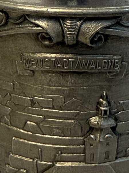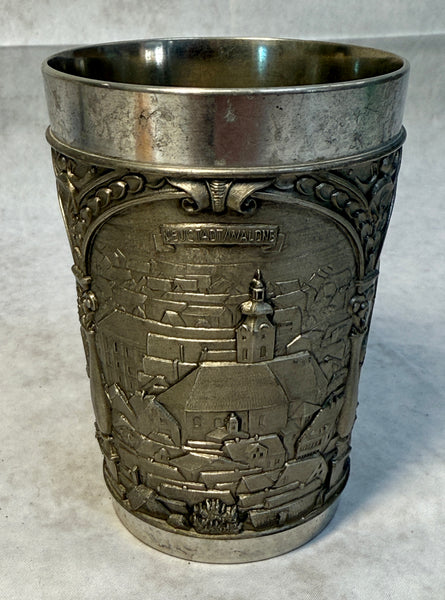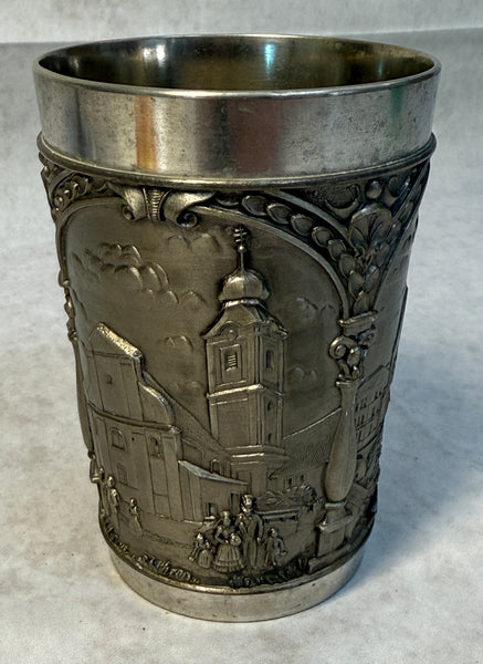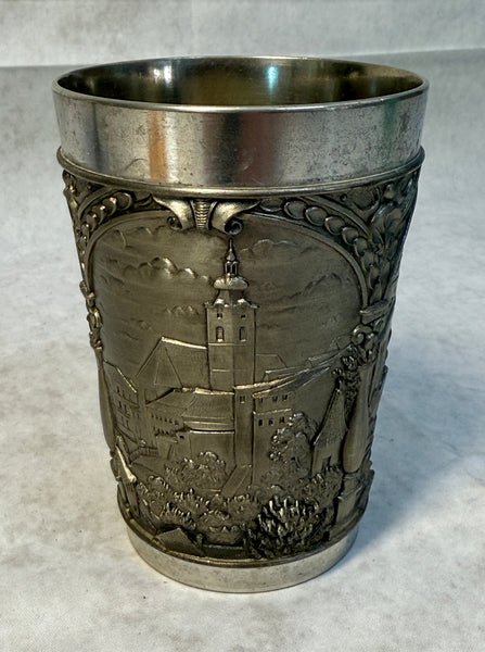 This vintage pewter cup is decorated with detailed low relief scenes of a German town. It's in Very Good Vintage Condition but needs a little cleaning. Made in West Germany.