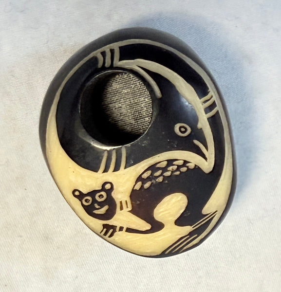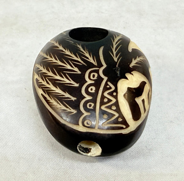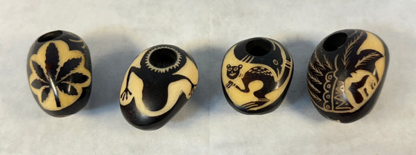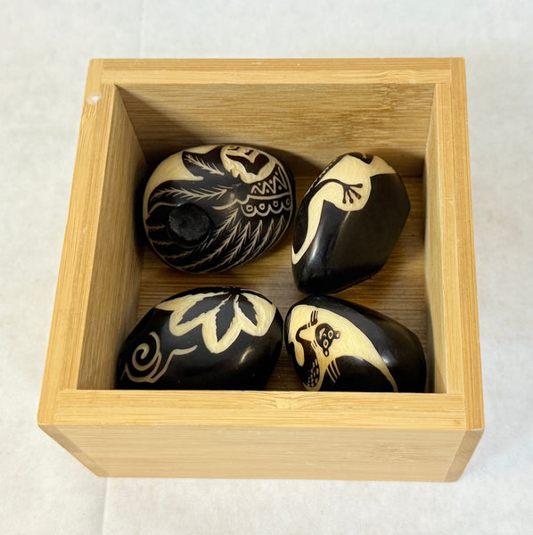 These little pipes are intricately carved to create four different images using the "sgraffito" technique. The polished tagua nuts (also known as "vegetable ivory") are lightly carved to reveal the lighter material beneath. They have only a slight bit of wear. The 4" x 4" bamboo box is included. Likely made in Colombia or Ecuador.
