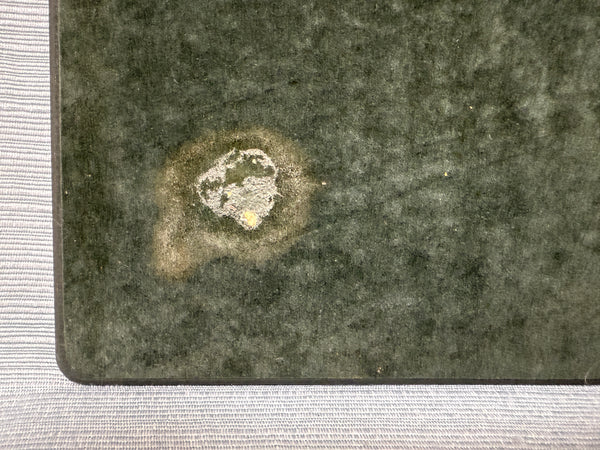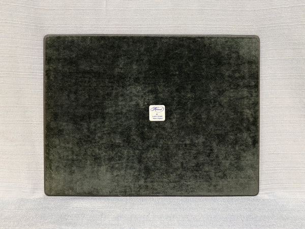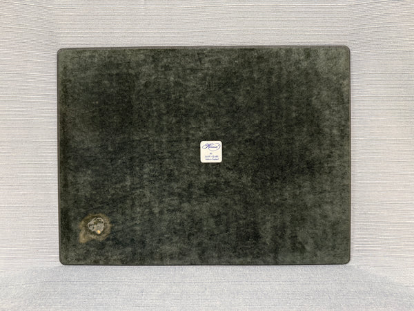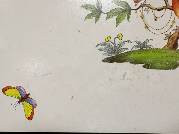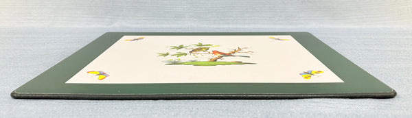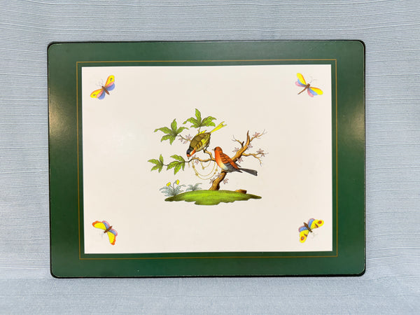 These hardboard placemats have rounded corners and a hunter green border around a colorful print of birds and butterflies. Three of the placemats have only slight wear; but one has some stains that may be able to be removed with some careful cleaning. Priced for condition.