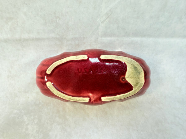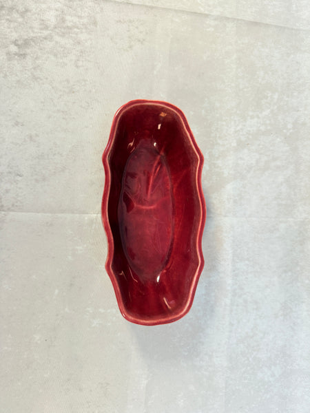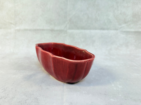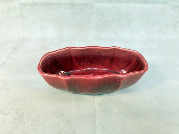 This vintage bowl has a scalloped oval shape and a subtle basketweave pattern under the maroon glaze. It's labeled USA, but might have been made by Hall or similar maker. It's in Very Good vintage Condition.