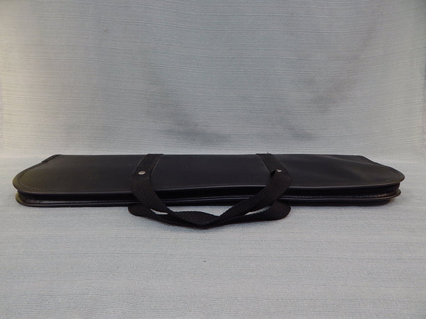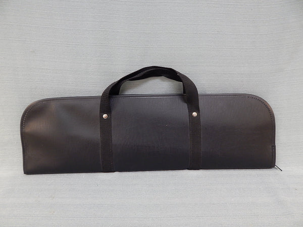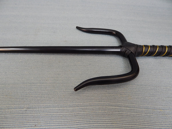 This pair of weapons used in Okanwan and South Chinese martial arts has a stabbing point in the middle and two side prongs. The handle is wrapped in black leather with gold braiding. The case is black leather with nylon carry straps. All are in Like New Condition.