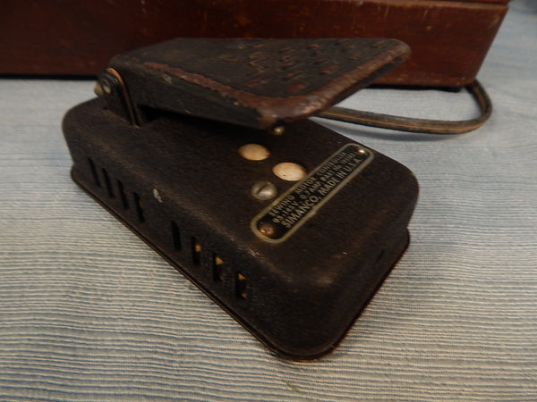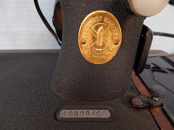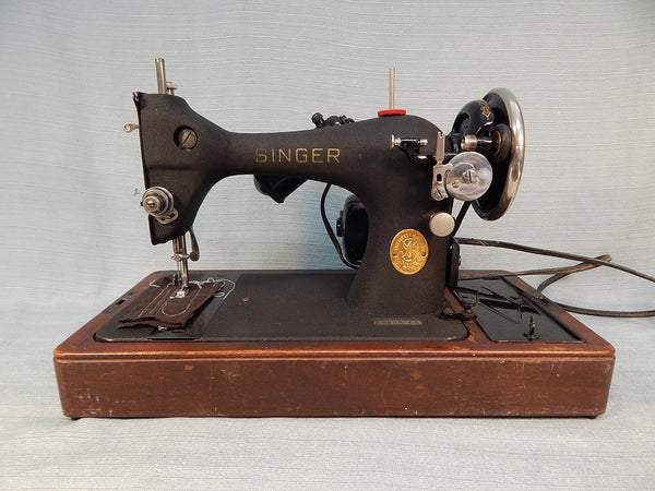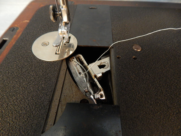 This 1946 model sewing machine has a black textured "Godzilla" finish and includes a bentwood case and foot pedal. It works and is in generally good shape, but there is wear on the bentwood case and the machine base. There is a "bullet" bobbin case with six long bobbins. The feet on the case have been replaced, as well as the spool pin felt and bobbin tire. One hinge pin bolt and the bobbin release pin are missing. The machine should be rewired and the light bulb replaced.