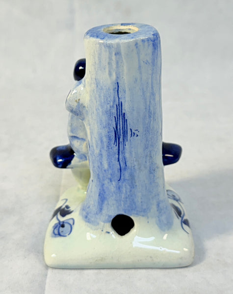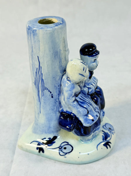 Classic blue on white porcelain lamp base, made in Delft, Holland. Made for a very small lamp, it is only 4" tall, but has holes for holding lamp hardware and power cord. Marked "Delft" on base.  This figurine of a couple resting against a tree is in Excellent condition with no chips, cracks. Glaze has some crazing.
