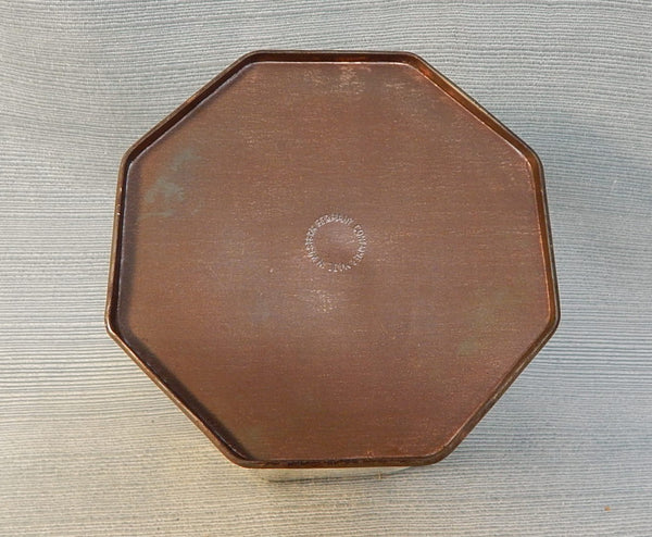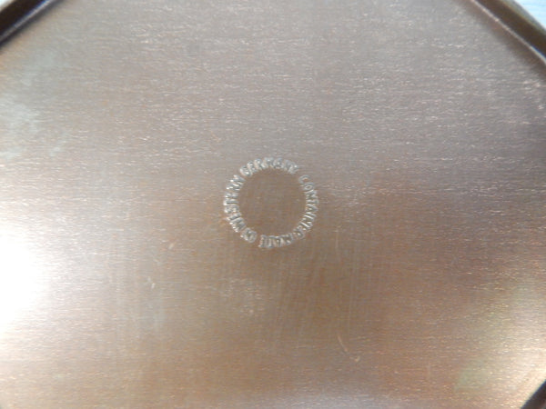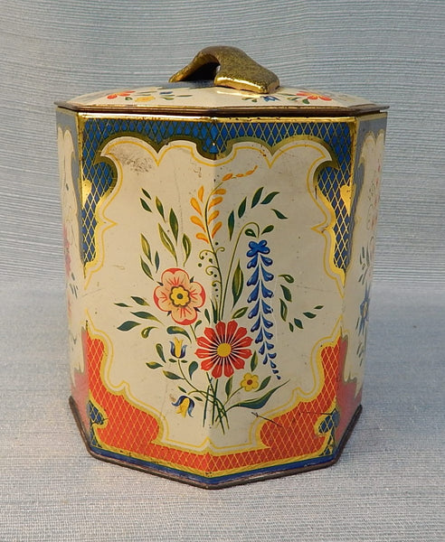 This pretty tin is decorated with colorful flowers bordered by blue, red and gold patterning. Made in West Germany.