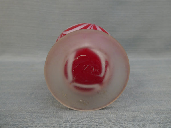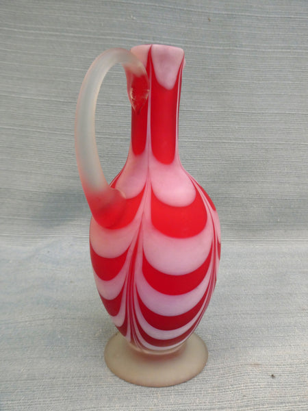 Beautiful feathered red and white satin glass cruet with frosted glass applied handle and base. In Excellent condition with no chips, cracks or scratches. 6.5" tall.