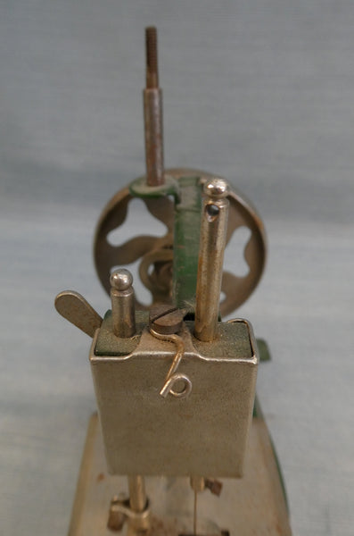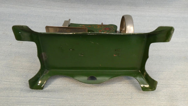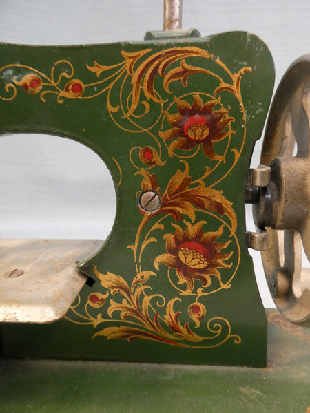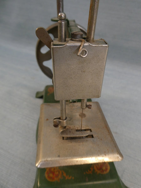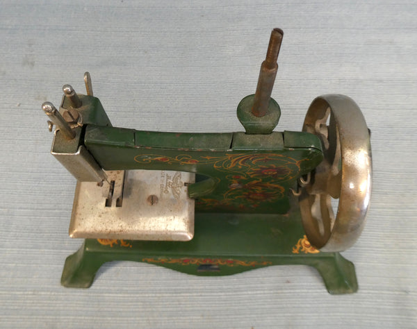 Fully functional sewing machine designed to teach young children how to sew. This green, German-made machine has tole style design. Made of stamped tin metal, painted and chrome finish on most moving parts. Untested, but moves properly and has all parts. Casige made toy sewing machines from 1902 to 1975. In Good condition, dusty and could use some cleaning.