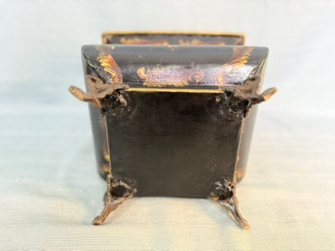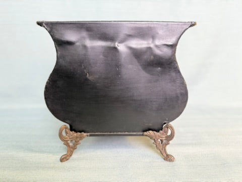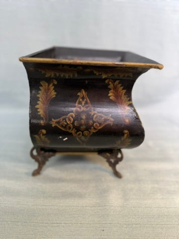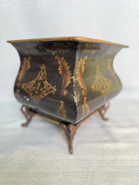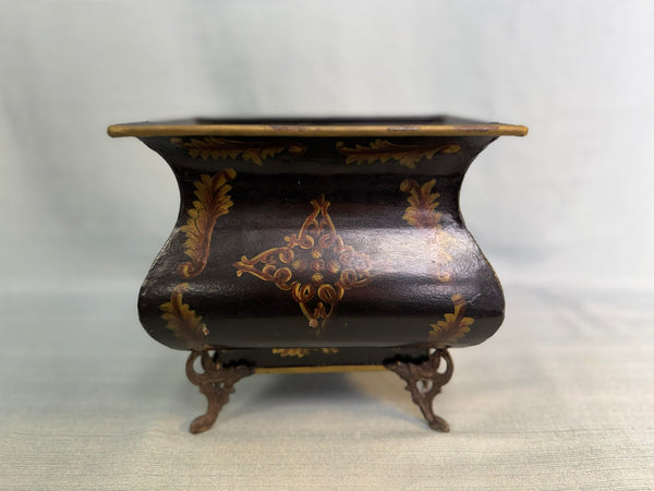 This Heavy black toleware cachepot has bronze feet and is painted with bronze color acanthus leaves and a curlicue design on three sides. One side is flat so it can fit against a wall. Makes a great planter base. Very Good Vintage Condition.