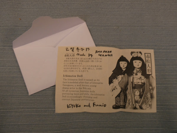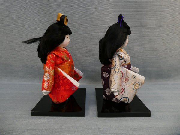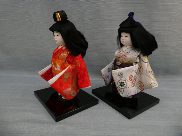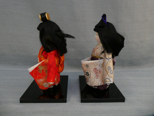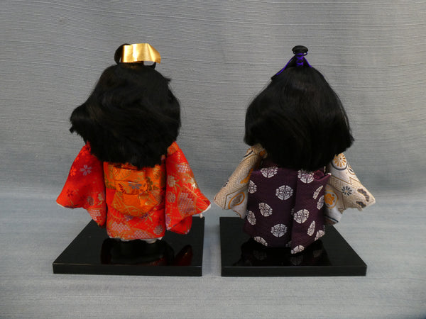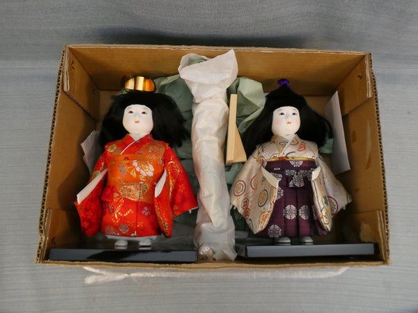 These 2 dolls are modeled after the Ichimatsu Sanogawa young dramatic actors of the Edo period in Japanese history. Named Kyoto and Fumio, these 9" dolls were made in Japan and come together in original box. Like New!