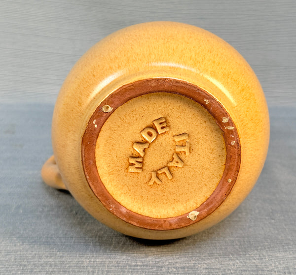 This nicely made pitcher has a yellow low gloss glaze with speckles. Very Good Condition, Made in Italy.