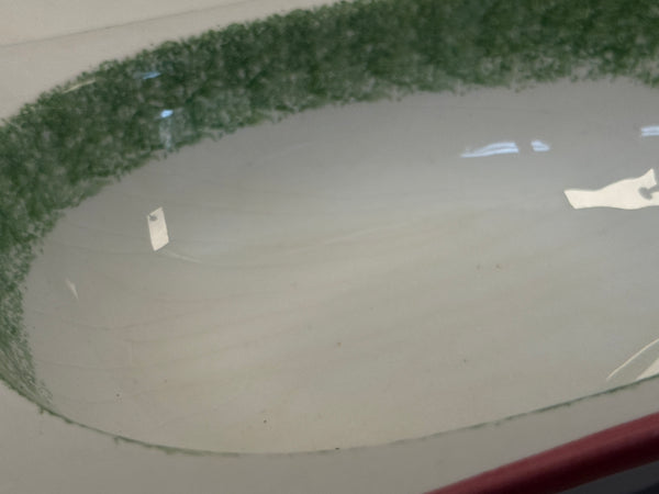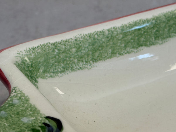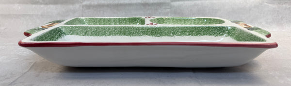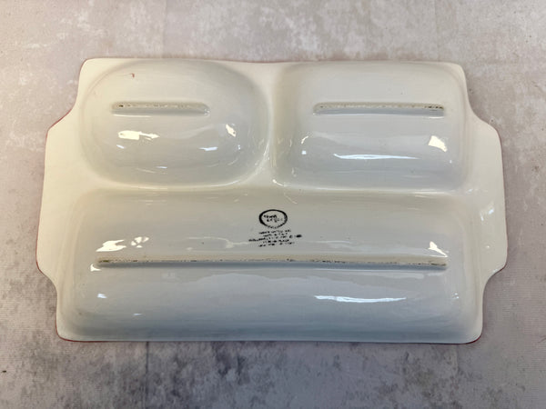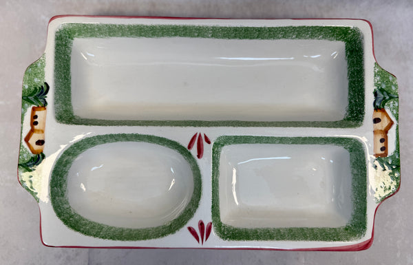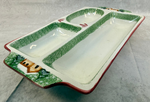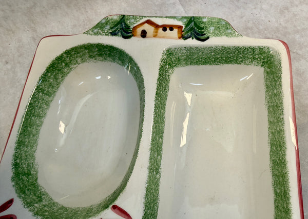 Hand painted ceramic dish with 3 sections. Adorned with Log Cabin design on side handles. In Good condition. No chips or cracks, but glaze has some crazing (shown in photos.)