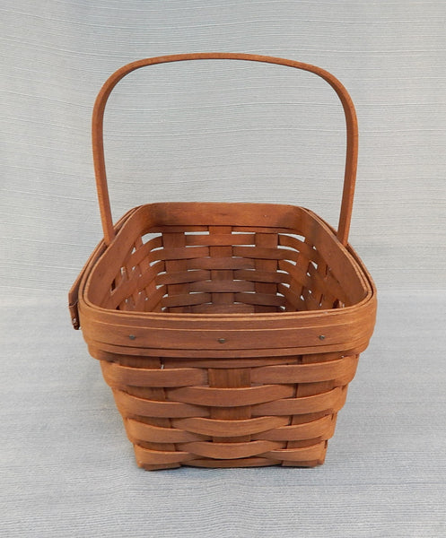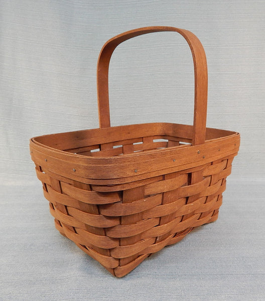 This medium dark woven wood basket has a fixed handle. Dated 2006, in Very Good Condition.