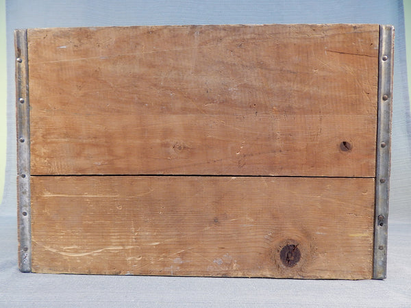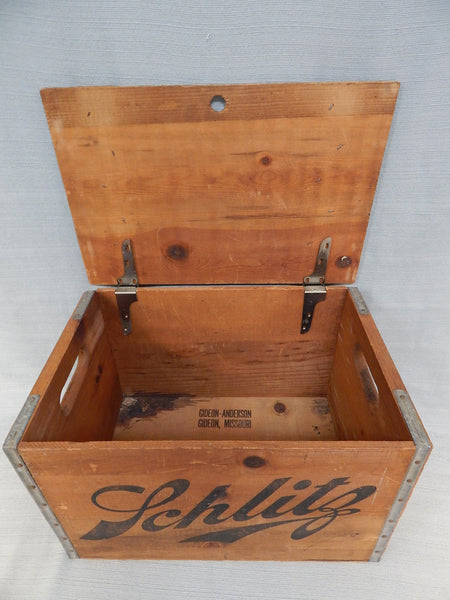 This wooden crate is adorned with classic Schlitz stensiled graphics including script black logo on front and red world logos on both sides. The top is marked "Lager X". Stamped inside "Gideon-Anderson, Gideon, Missouri". Has metal hinges. In Very Good condition.