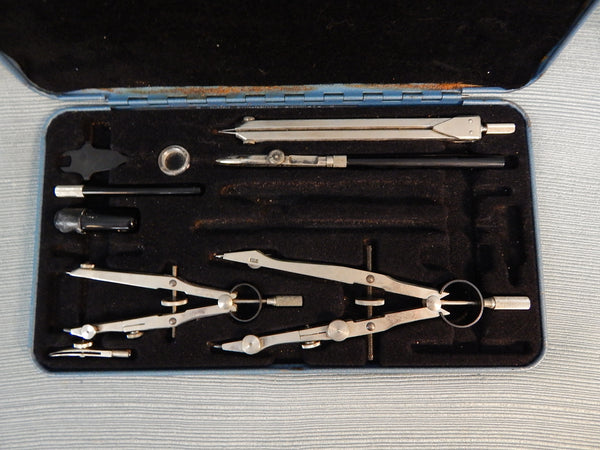 This set includes small compasses with beam attachment and ink adapter, dividers, ink ruing pen and mechanical pencil. Made by Gramercy in Germany, except the mechanical pencil, which is made by Staedtler Mars. The case is metal with a blue finish that has a good bit of wear.
