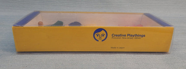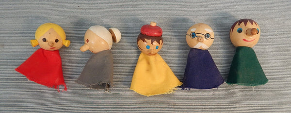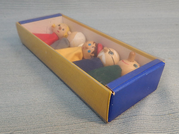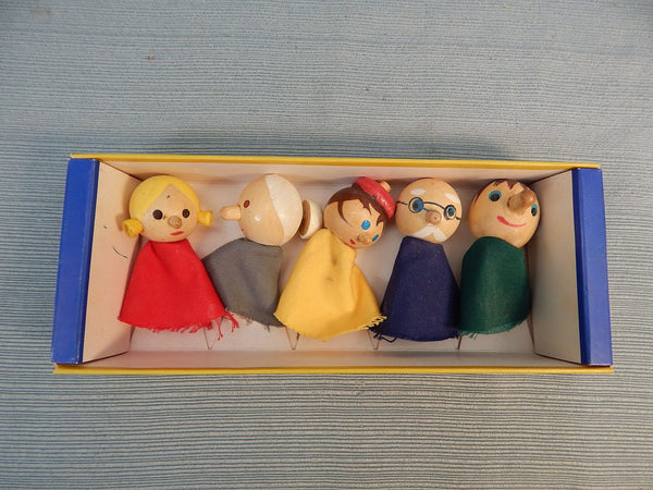 This set of vintage finger puppets includes 5 people, each with a 1" wooden head and 2" cloth clothing. These toys come together in original box. For ages 3+, this set includes a boy, a girl, an old woman, an old man and an artist. Made in Japan for Creative Playthings. All are new in box, but they some slight dirt and dust.