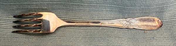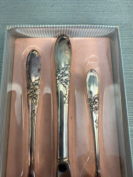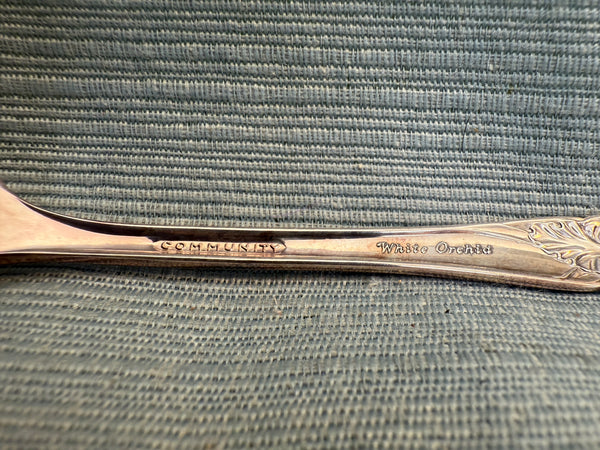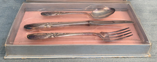 This set of White Orchid pattern silver plated utensils by Community Plate includes 3 pieces - 6.25" fork, 7" knife and 5.25" spoon. All are sized slightly smaller for a child to use. They come in original box and show no signs of use.