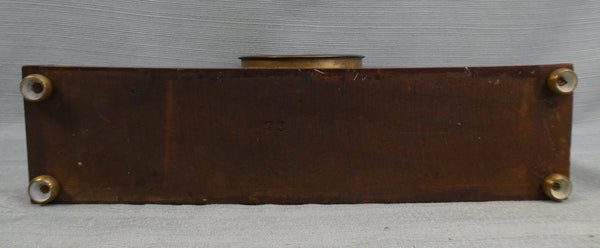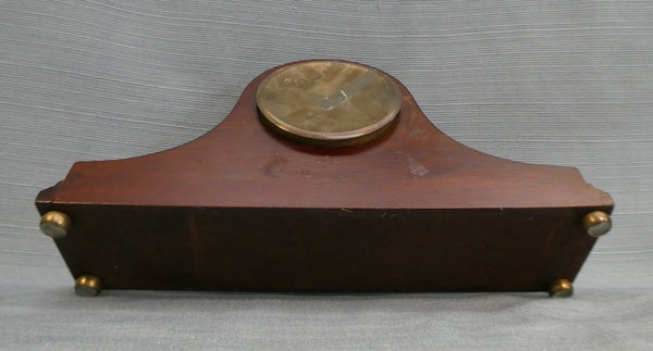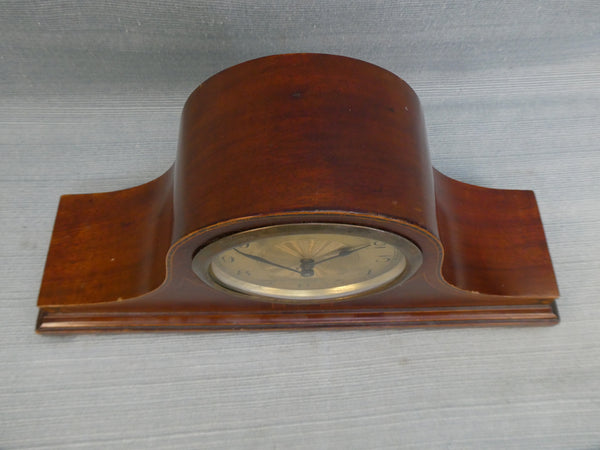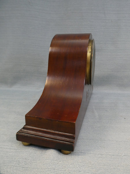This mahogany mantel clock is smaller than usual. It has nice inlays on the front and a wood clock face. it works! No brand name could be found. Good Vintage Condition.